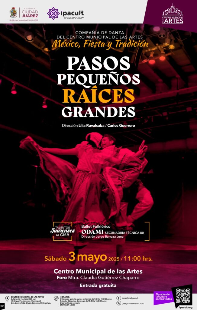 CD. JUAREZ, CHIH.-El Instituto para la Cultura del Municipio de Juárez (IPACULT) hace una cordial invitación a la comunidad juarense para disfrutar del espectáculo de danza “Pequeños pasos, Raíces grandes”, que se presentará de manera gratuita este sábado 3 de mayo a las 11:00 de la mañana en el Centro Municipal de las Artes (CMA).