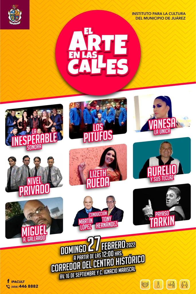 CD. JUAREZ, CHIH.- Como parte de las actividades públicas que presenta el Instituto para la Cultura del Municipio de Juárez (IPACULT), este domingo 27 de febrero se realiza la segunda edición del programa Arte en las Calles, evento que por tradición se lleva a cabo en el Centro Histórico de la ciudad.
