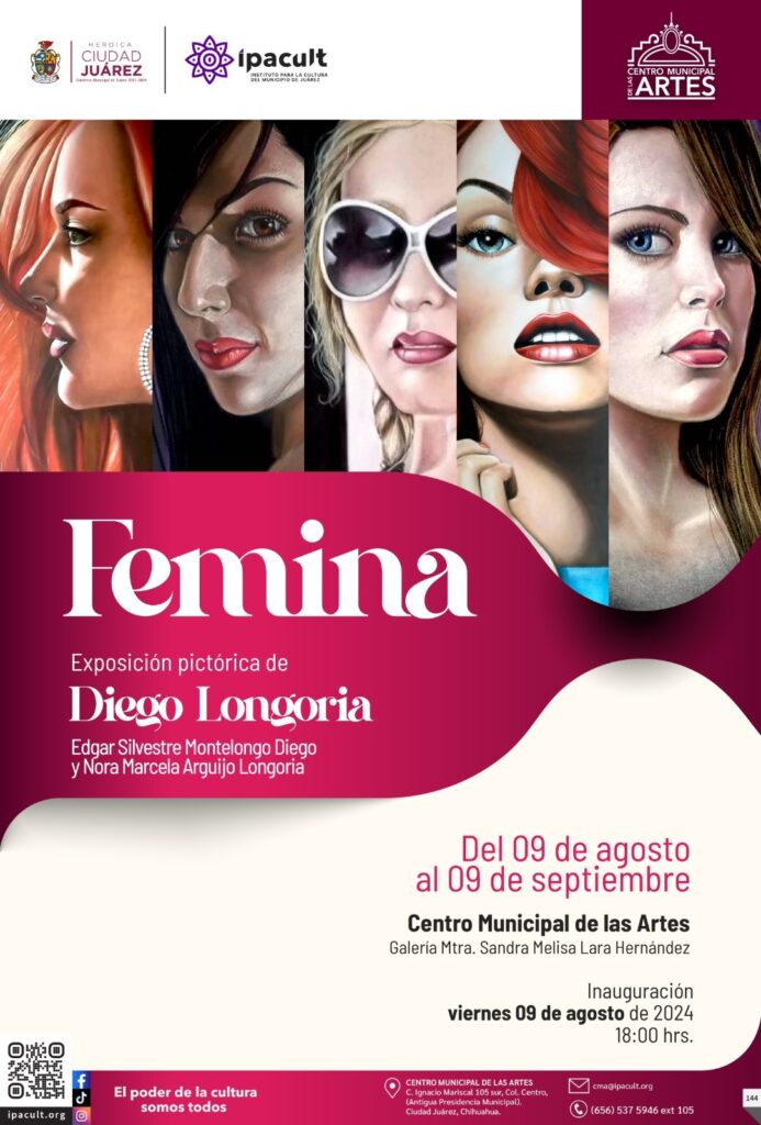 CD. JUAREZ, CHIH.- El Instituto para la Cultura del Municipio de Juárez (IPACULT) invita a la ciudadanía a disfrutar de la exposición pictórica “Fémina” de la artista Nora Marcela Arguijo Longoria, en honor a Edgar Silvestre Montelongo Diego, la cual se exhibirá en la galería «Melisa Lara Hernández» del Centro Municipal de las Artes (CMA).