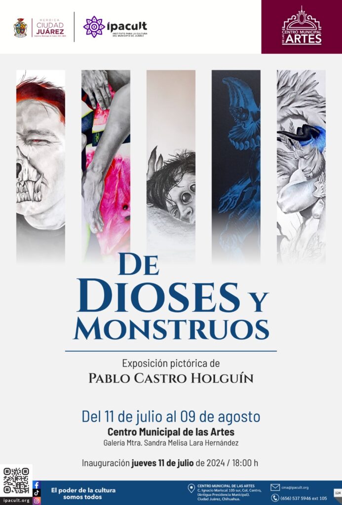 CD. JUAREZ, CHIH.- El Instituto para la Cultura del Municipio de Juárez (IPACULT) invita a toda la ciudadanía a la exposición pictórica «De Dioses y Monstruos», del artista plástico Pablo Castro Holguín, la cual será exhibida en la galería «Melisa Lara Hernández» del Centro Municipal de las Artes (CMA).