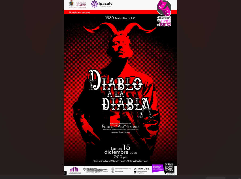 CD. JUAREZ, CHIH.- Como parte del programa Salvemos los lunes de teatro, el Instituto para la Cultura del Municipio de Juárez (IPACULT) invita a la ciudadanía a asistir a la función teatral “Diablo a la diabla”, que se presentará este lunes 15 de diciembre a las 7:00 de la tarde en el Centro Cultural Ernesto Ochoa Guillemard.