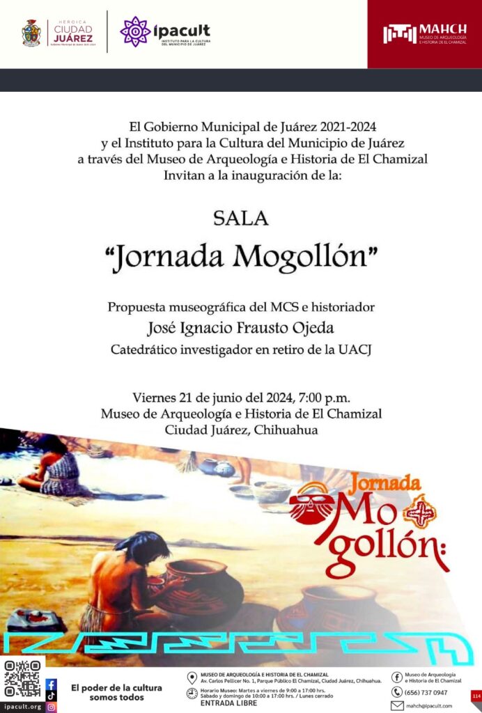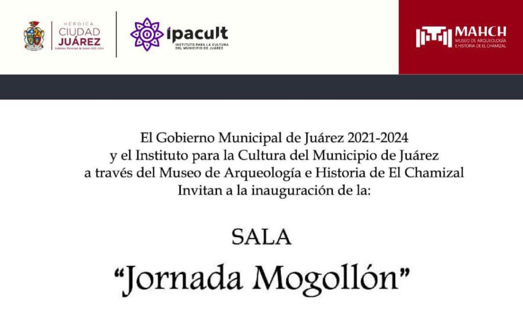 CD. JUAREZ, CHIH.- El Gobierno Municipal, a través del Instituto para la Cultura del Municipio de Juárez (IPACULT), encabezado por Myrna Judith Barajas Martínez, extiende una cordial invitación a la comunidad para asistir a la inauguración de la nueva «Sala: Jornada Mogollón», evento que se llevará a cabo este viernes a las 7:00 de la tarde en el Museo de Arqueología e Historia de El Chamizal.
