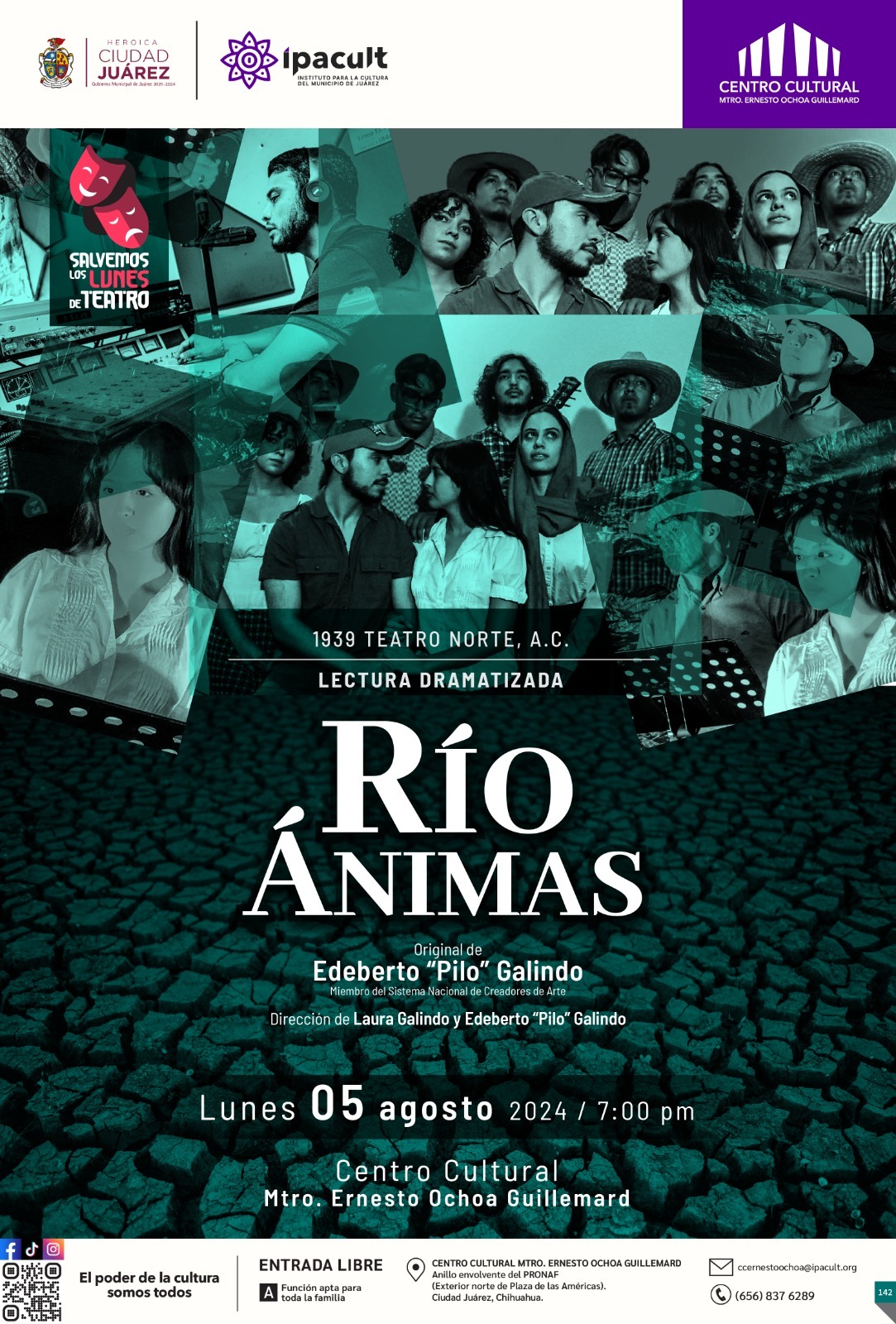 CD. JUAREZ, CHIH.- El Instituto para la Cultura del Municipio de Juárez (IPACULT) extiende una cordial invitación a la ciudadanía para asistir a la lectura dramatizada de «Río Ánimas», dirigida por el reconocido dramaturgo Edeberto «Pilo» Galindo y Laura Galindo.
