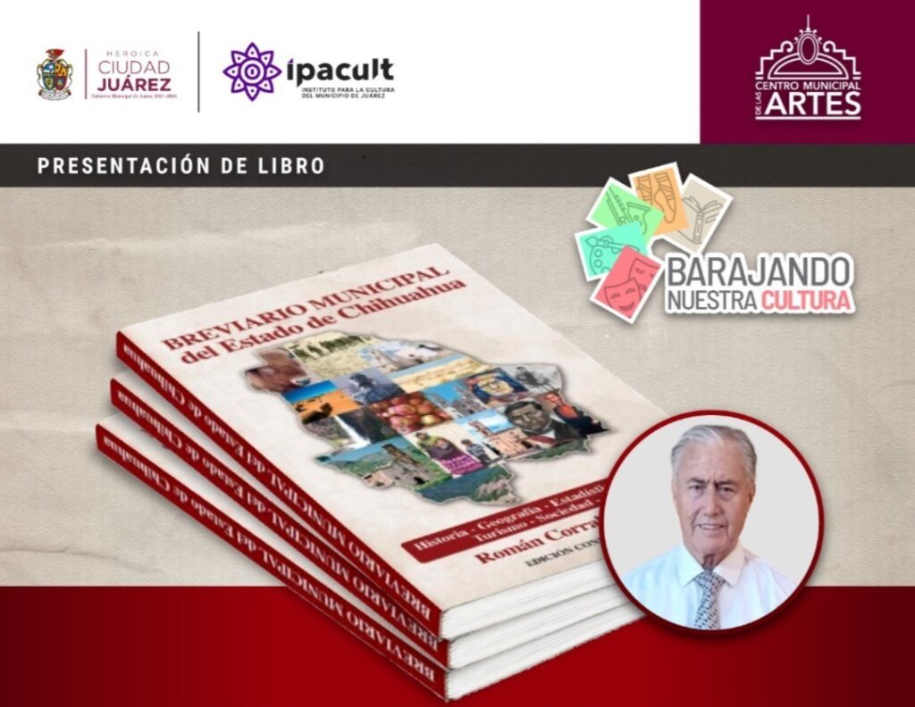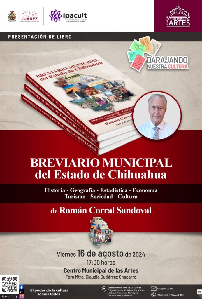 CD. JUAREZ, CHIH.- El Instituto para la Cultura del Municipio de Juárez (IPACULT) hace un llamado a la ciudadanía para asistir a la presentación del libro Breviario Municipal del Estado de Chihuahua de Román Corral Sandoval, que se llevará a cabo el próximo viernes 16 de agosto a las 5:00 de la tarde en el Centro Municipal de las Artes (CMA).