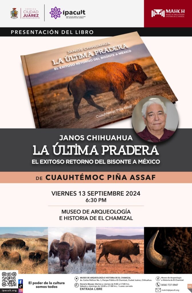CD. JUAREZ, CHIH.- El Instituto para la Cultura del Municipio de Juárez (IPACULT) invita a la presentación del libro “La Última Pradera: El Exitoso Retorno del Bisonte a México”, que se llevará a cabo el próximo viernes 13 de septiembre a las 6:30 de la tarde en el Museo de Arqueología e Historia de El Chamizal (MAHCH).