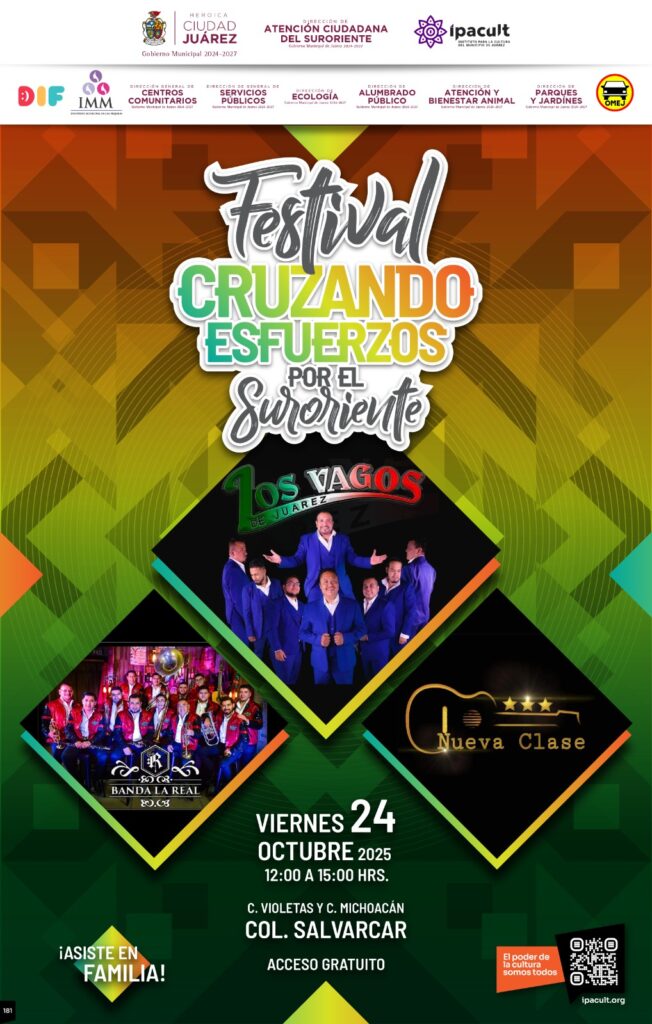 CD. JUAREZ, CHIH.- El Instituto para la Cultura del Municipio de Juárez (IPACULT) invita a la comunidad a disfrutar del “Festival Cruzando Esfuerzos por el Suroriente”, que se realizará el próximo viernes 24 de octubre a las 12:00 del mediodía en el Parque Gladiolas, ubicado entre las calles Violetas y Michoacán, en la colonia Salvarcar.