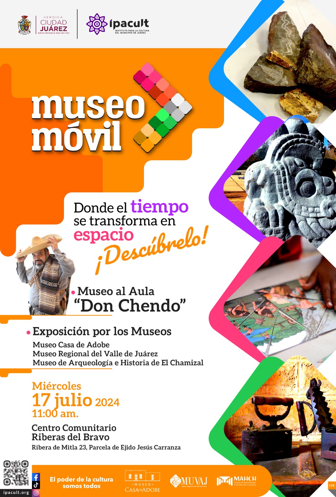 CD. JUAREZ, CHIH.- El Instituto para la Cultura del Municipio de Juárez (IPACULT), dirigido por Myrna Judith Barajas Martínez, invita a toda la ciudadanía a disfrutar de la exhibición del “Museo Móvil”, que se llevará a cabo el próximo miércoles 17 de julio a las 11:00 de la mañana en el Centro Comunitario Riberas del Bravo.