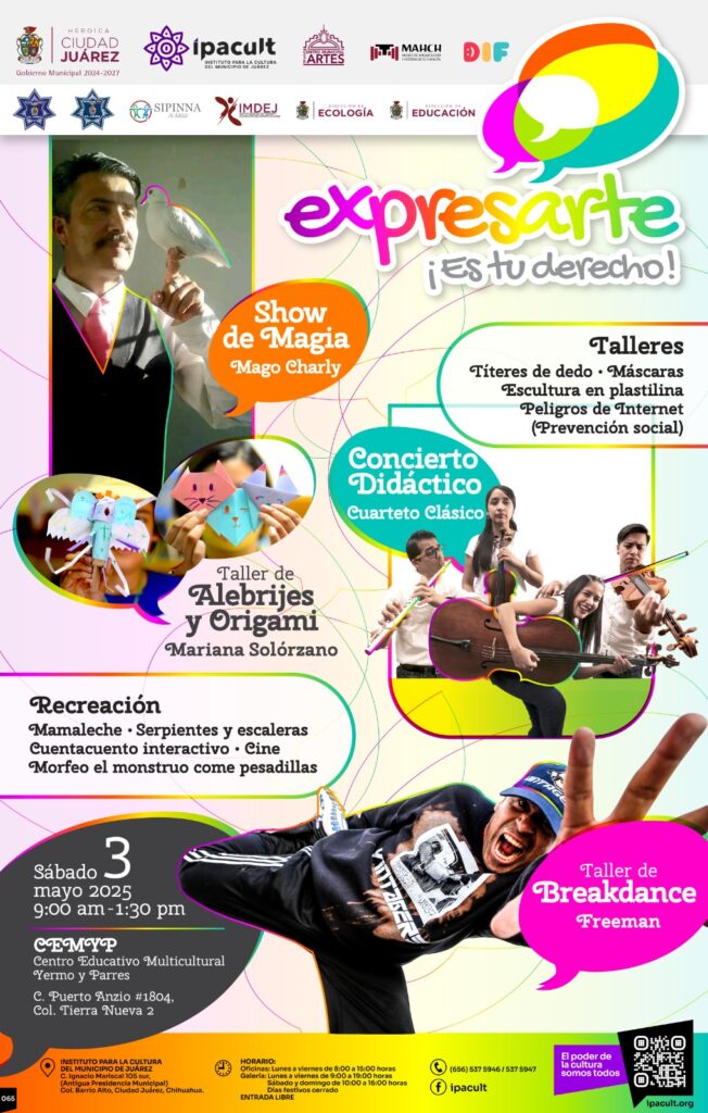 CD. JUAREZ, CHIH.- En una iniciativa que busca fortalecer la cultura, el arte y los derechos de la infancia, el Instituto para la Cultura del Municipio de Juárez (IPACULT) llevará el programa “Expresarte: ¡Es tu derecho!” al Centro Educativo Multicultural Yermo y Parres (CEMYP) este sábado 3 de mayo a partir de las de 9:00 de la mañana.