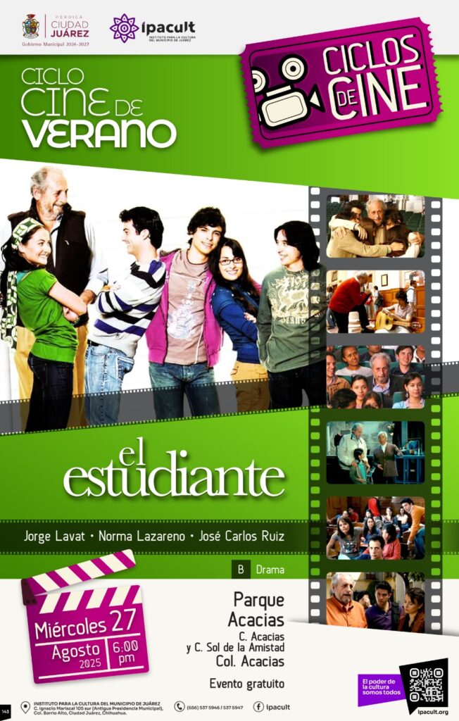 CD. JUAREZ, CHIH.- El Instituto para la Cultura del Municipio de Juárez (IPACULT) continúa con su misión de acercar el arte y la cultura a la comunidad y como parte de su programa “Ciclos de Cine”, este miércoles 27, en el Parque Acacias, se proyectará la película mexicana El Estudiante.