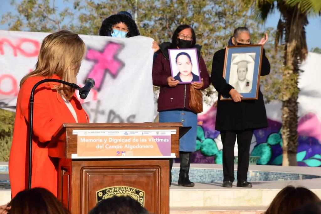 En compañía de Belén Sanz Luque, representante de ONU Mujeres en México; Ana Margarita Blackaller Prieto, directora General del Instituto Chihuahuense de las Mujeres; Fabiola Alanis Samano, Comisionada Nacional para Prevenir y Erradicar la Violencia contra las Mujeres, CONAVIM; Cruz Pérez Cuéllar, Presidente Municipal de Ciudad Juárez y familiares de las mujeres víctimas de feminicidio, la Gobernadora reconoció que lo ocurrido en Campo Algodonero hace 20 años es una grave herida, no sólo en la historia de varias familias juarenses, sino de toda la comunidad.