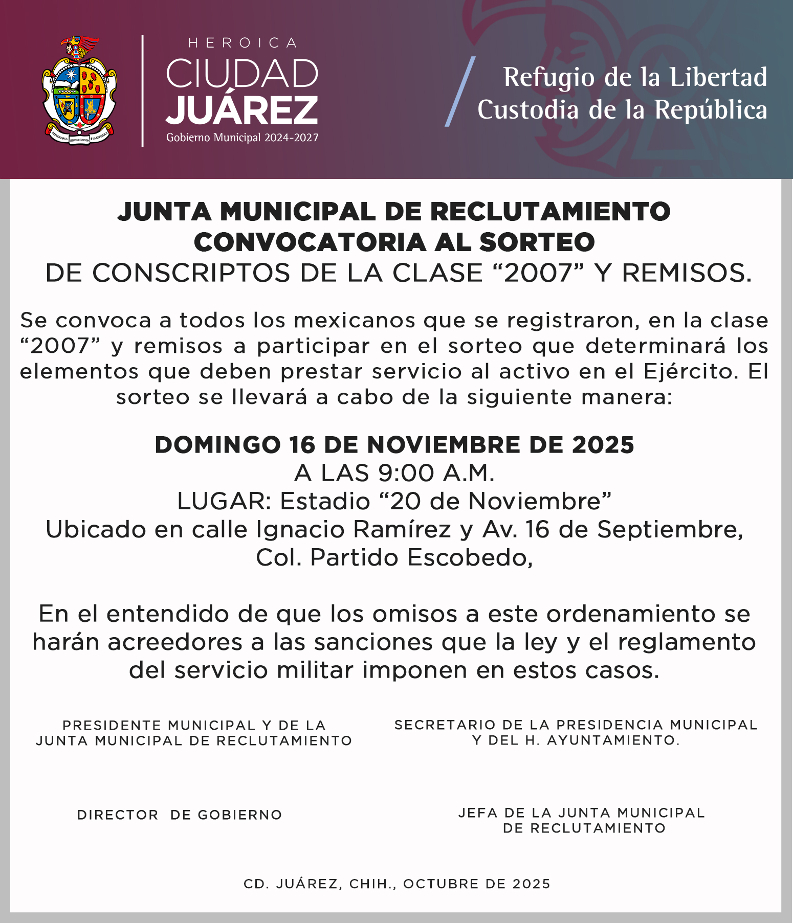 CD. JUAREZ, CHIH.- La titular de la dependencia, Viridiana Gómez, dijo que se convoca a todos los mexicanos que se registraron en la clase 2007 y remisos a participar en el sorteo que determinará los elementos que deben prestar el servicio activo en el Ejército Mexicano.