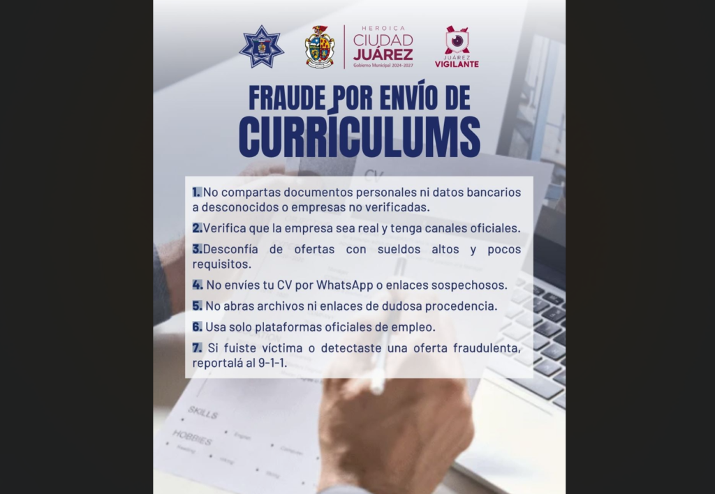 CD. JUAREZ, CHIH-. La Secretaría de Seguridad Pública Municipal, a través de la Dirección de Investigación y la Policía Cibernética, alerta a la comunidad sobre una nueva modalidad de fraude digital relacionada con el envío de currículums y falsas ofertas de trabajo.