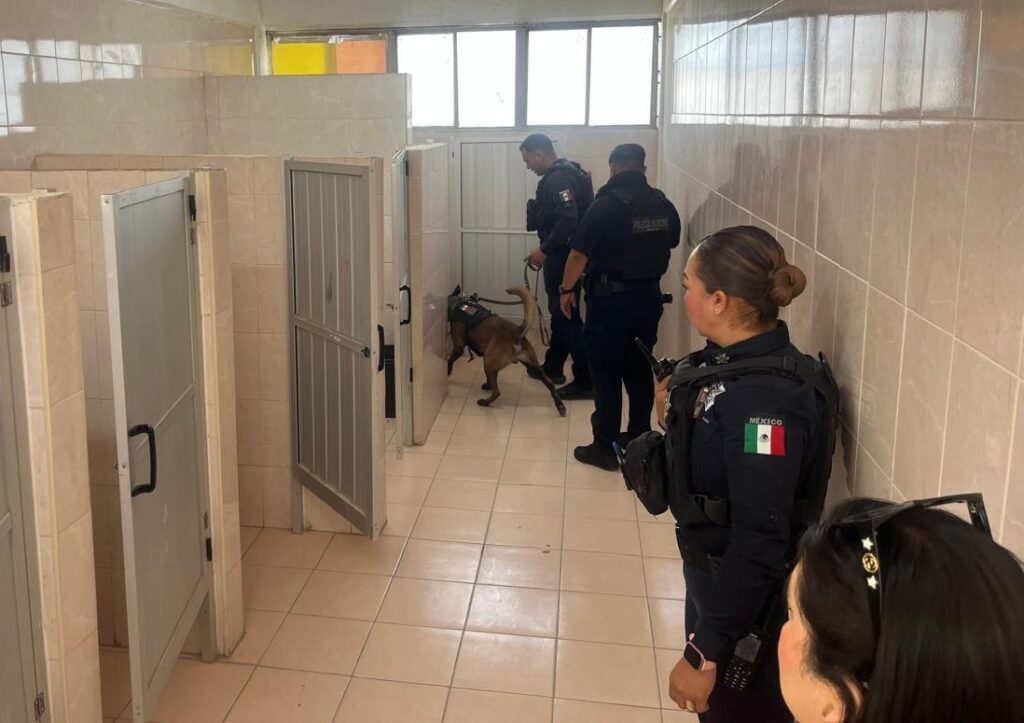 Policías municipales adscritos a la Dirección de Prevención Social se trasladaron al plantel educativo, ubicado en la colonia Ladrilleros y Caleros, en compañía de binomios caninos pertenecientes al agrupamiento K-9, para llevar a cabo la intervención.