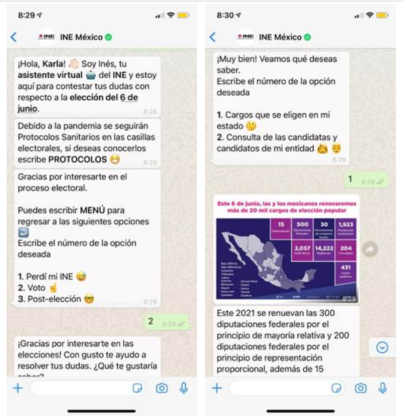 «Nos enorgullece ser parte de esta alianza con el INE y Auronix para asistir a los ciudadanos mexicanos durante las próximas elecciones. En WhatsApp creemos que la buena información es una de las formas más efectivas de combatir la desinformación y este chatbot justamente se convertirá en una fuente de información confiable a la que los electores podrán acceder de manera fácil y rápida para obtener datos oficiales útiles sobre estos comicios que se realizan en condiciones muy especiales por la pandemia», resaltó Paloma Szerman, gerente de Políticas Públicas de WhatsApp para América Latina.