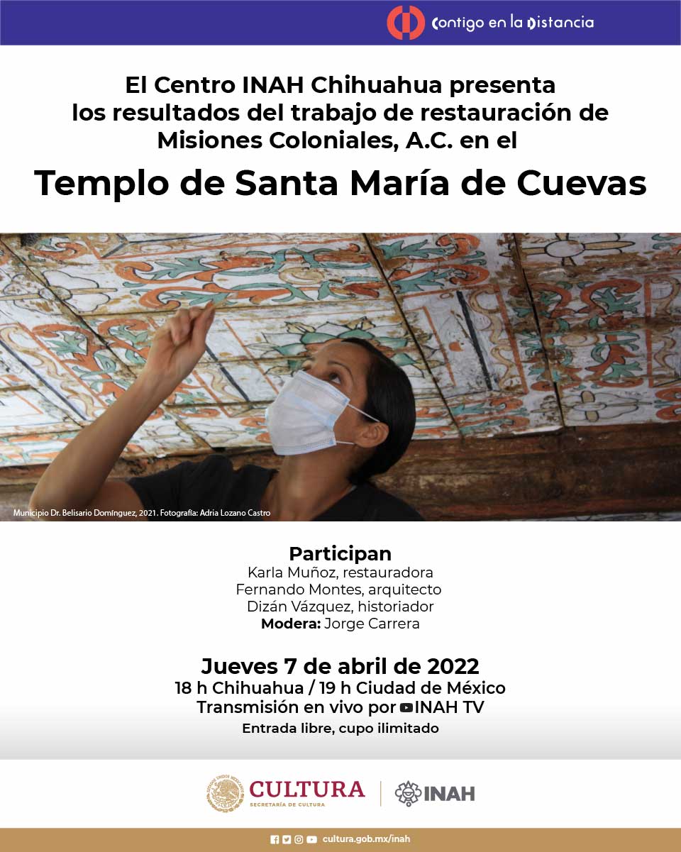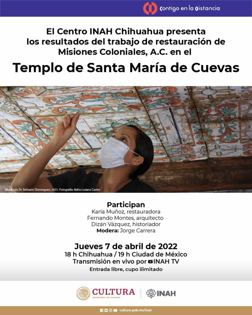El primero de los eventos será destinado a dar a conocer los Resultados del trabajo de restauración de Misiones Coloniales A.C. en el Templo de Santa María de Cuevas, mostrando el antes y después de la intervención en el sitio, así como la evaluación diagnóstica y las técnicas y métodos aplicados por los especialistas en este tesoro del municipio de Dr. Belisario Domínguez. Jueves 7 de abril de 2022 a las 18 h (Chihuahua).