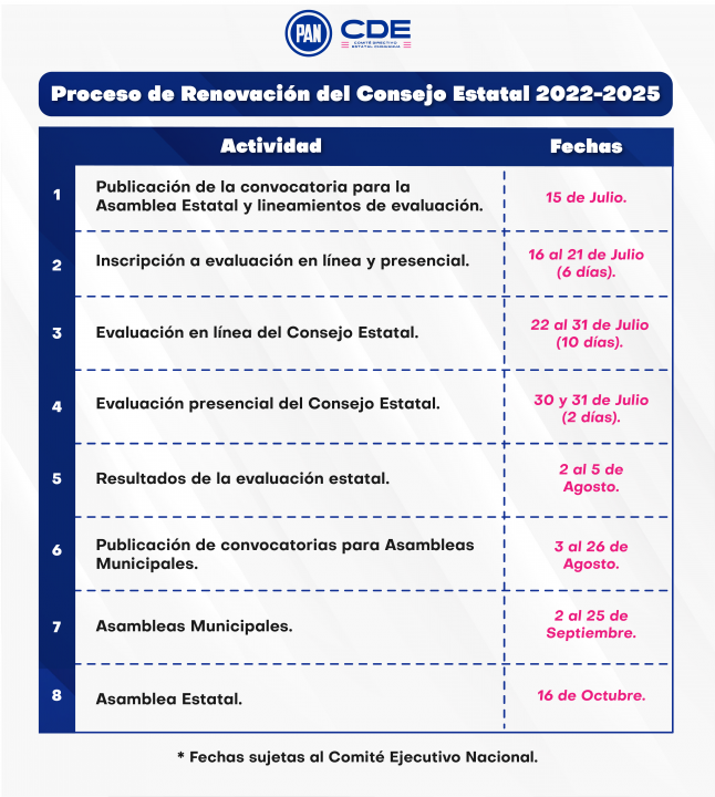 La convocatoria para la Asamblea Estatal y los lineamientos de evaluación serán publicados el día 15 de julio. Del 22 al 31 de julio se realizará la evaluación en línea para los aspirantes al Consejo Estatal. El 30 y 31 de julio será la evaluación presencial y los resultados serán publicados del 2 al 5 de agosto. Del 3 al 26 de agosto se publicarán las convocatorias para las Asambleas Municipales en las que se elegirán a las nuevas mesas directivas y se llevarán a cabo del 2 al 25 de septiembre.