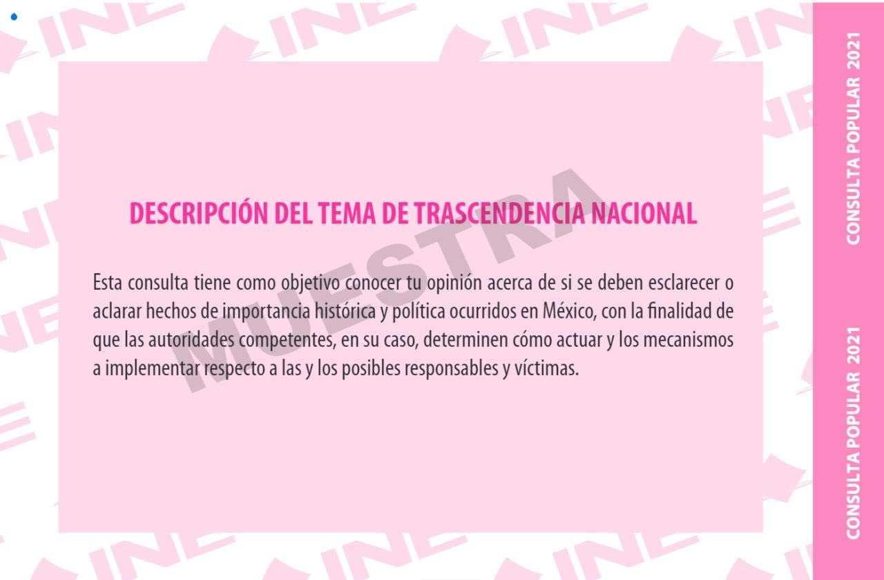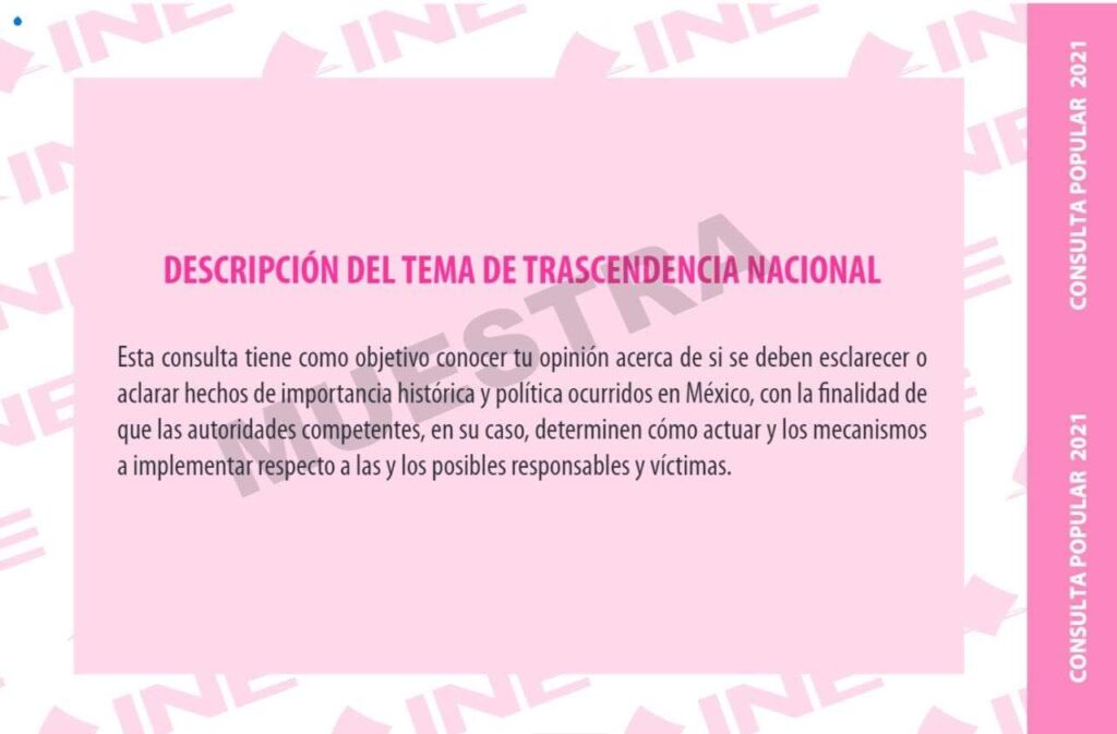 Las papeletas que se utilizarán durante la Consulta están impresas en tamaño media carta, en papel bond y en su parte frontal se puede leer la pregunta objeto de la Consulta, que fue avalada por la Suprema Corte de Justicia de la Nación, así como las dos opciones de respuesta que estarán disponibles para que la ciudadanía manifieste su decisión: sí y no.