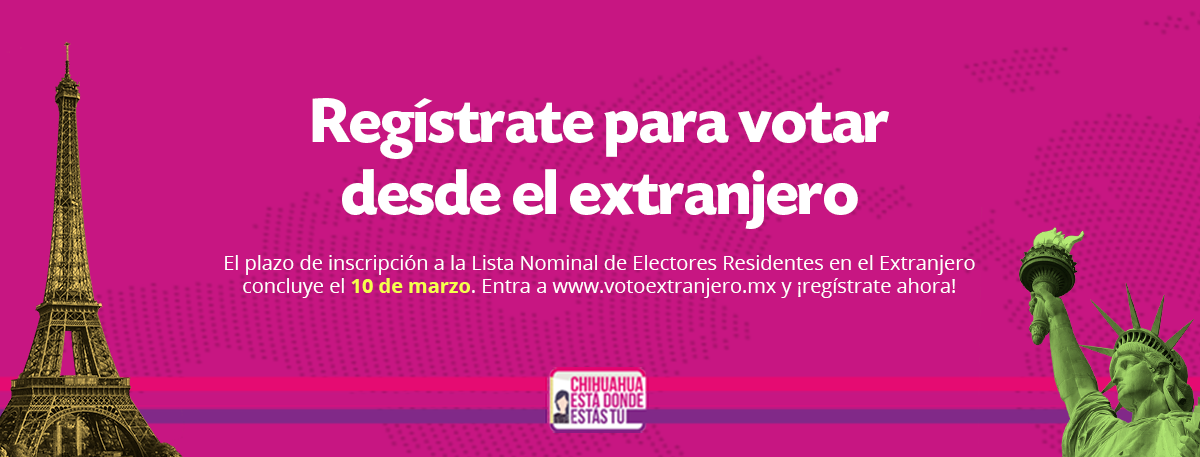 CHIHUAHUA, CHIH.- El próximo 10 de marzo vence el plazo para registrarse ante el Sistema de Registro para Votar desde el Extranjero, por lo que el Instituto Estatal Electoral de Chihuahua (IEE) hace el llamado a las y los chihuahuenses que residen fuera del país y que cuentan con una credencial para votar vigente, a que realicen este trámite y así puedan ejercer su derecho a votar en el Proceso Electoral Local 2020-2021.