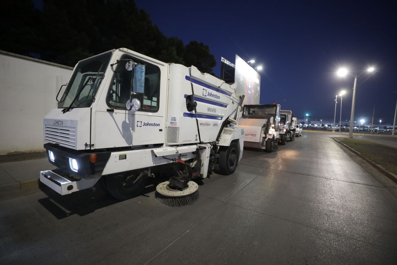 Coordinadores operativos de las Direcciones de Parques y Jardines, Limpia y Alumbrado Público, encabezaron el operativo nocturno con maquinaria pesada como barredoras mecánicas, pipas de agua tratada y canastillas de alumbrado.