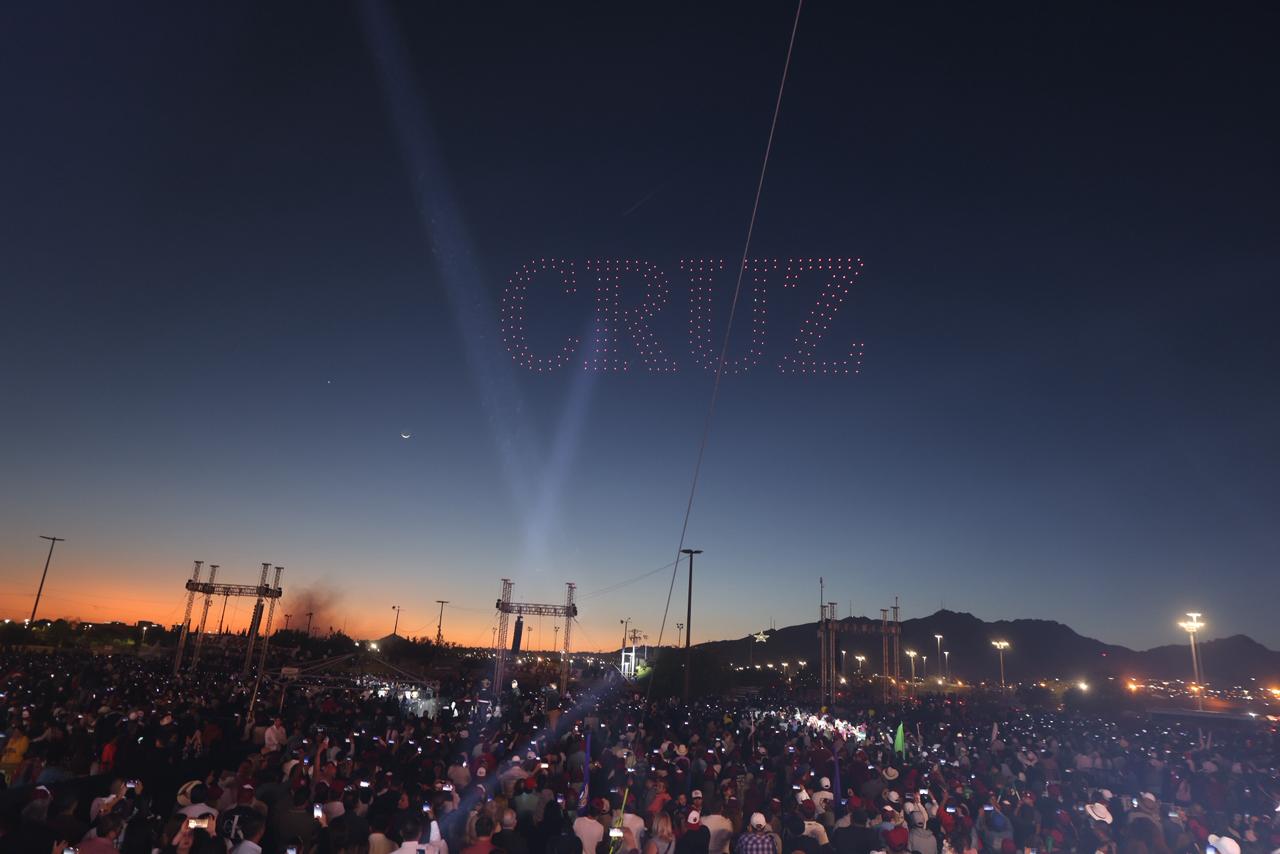 La jornada cerró con un espectáculo de drones que entre varias formaciones, formaron la palabra de CRUZ, para luego pasar a la presentación musical de La Zenda Norteña, consolidando un evento que combinó entretenimiento con un claro posicionamiento político ante una amplia convocatoria ciudadana.
