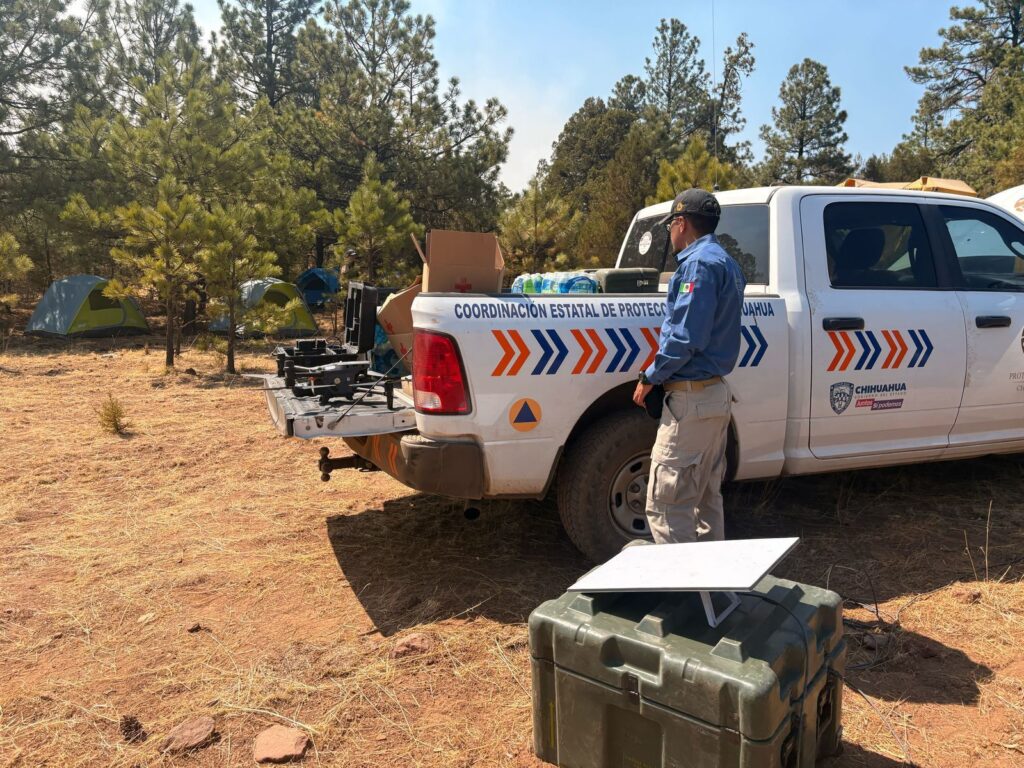 CD. JUAREZ, CHIH.-Personal de la Coordinación Estatal de Protección Civil (CEPC), llevó a combatientes incendios forestales que trabajan en el municipio de Madera, equipo de comunicación satelital y suministros esenciales, en apoyo a su labor.