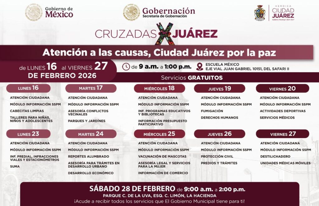 CD. JUAREZ, CHIH.- El próximo sábado 28 de febrero se llevará a cabo el programa “Cruzadas por Juárez, Atención a las Causas, Ciudad Juárez por la Paz”, de 9:00 de la mañana a 2:00 de la tarde en el parque ubicado en la calle de la Uva cruce con Limón en La Hacienda, al surponiente de la ciudad.