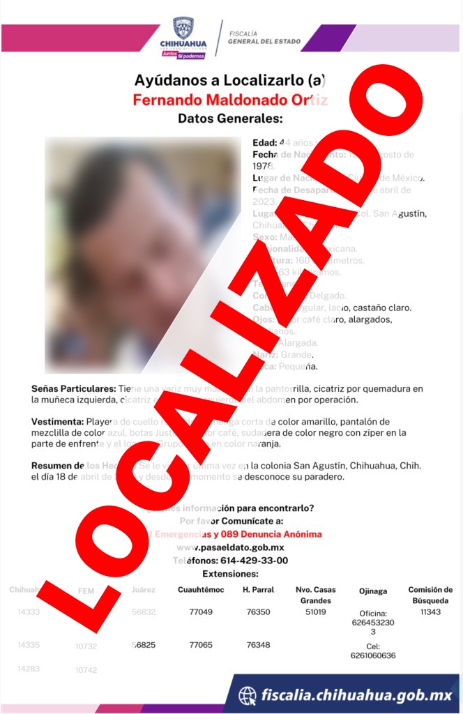 Este martes 02 de mayo, la Agencia estatal de Investigación, informó que Fernando M. O., de 44 años de edad, de oficio chofer, fue localizado sano y salvo en Ciudad Juárez.
