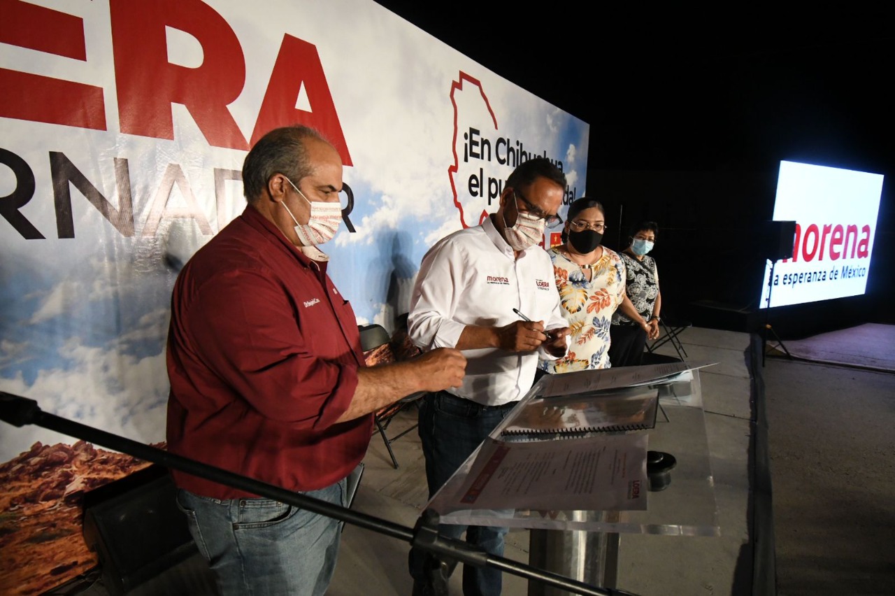 CD. JUAREZ, CHIH.- Juan Carlos Loera, candidato a gobernador de la coalición Juntos Haremos Historia en Chihuahua, firmó compromisos para el progreso de 18 mil familias de Valle del Sol, que incluye su polígono Senderos, Cuatro Siglos y Waterfill, concentrados en más de 120 fraccionamientos.