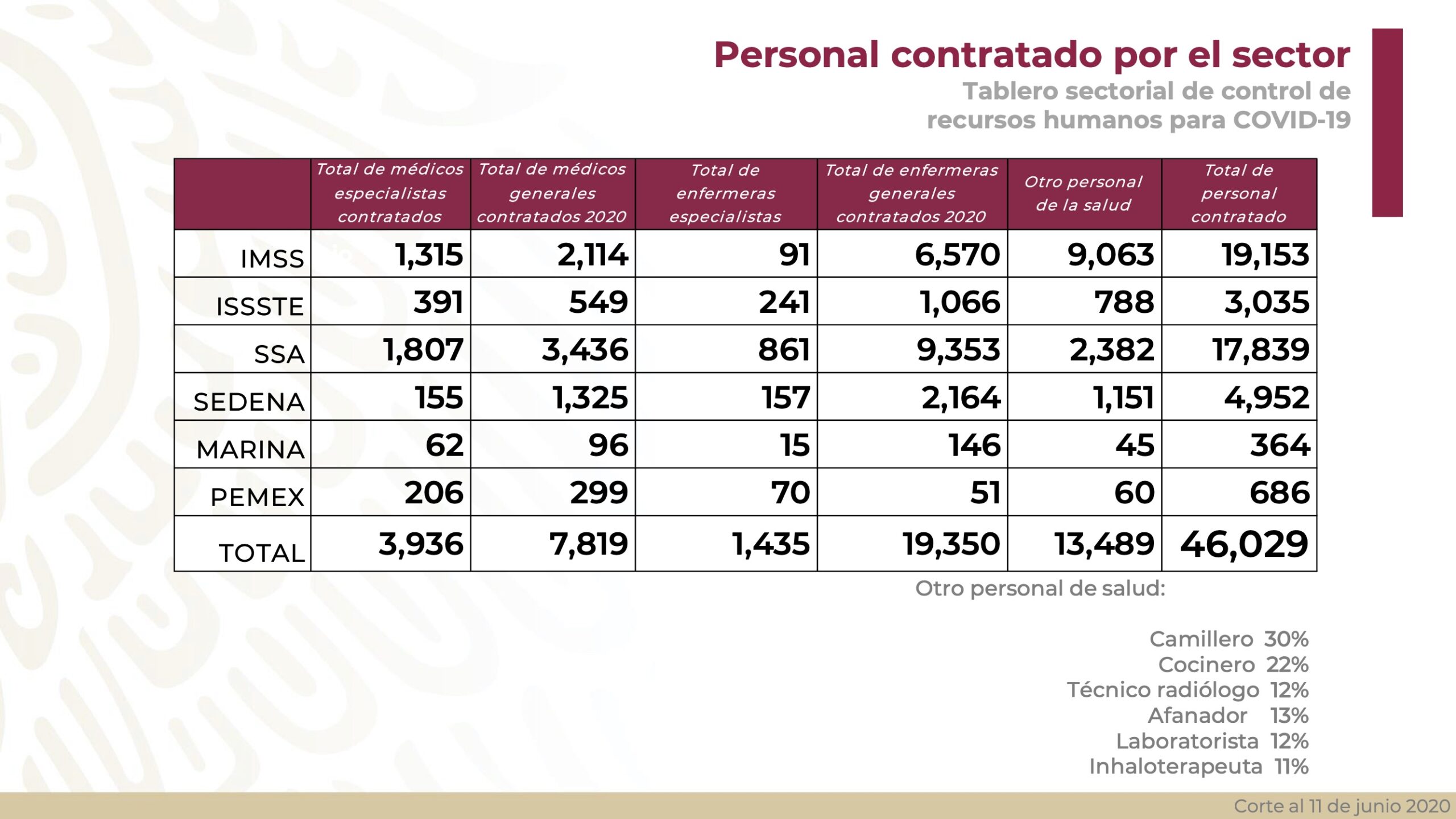 Asimismo resaltó la contratación extraordinaria de 46 mil 29 profesionales de la salud y personal para los hospitales.