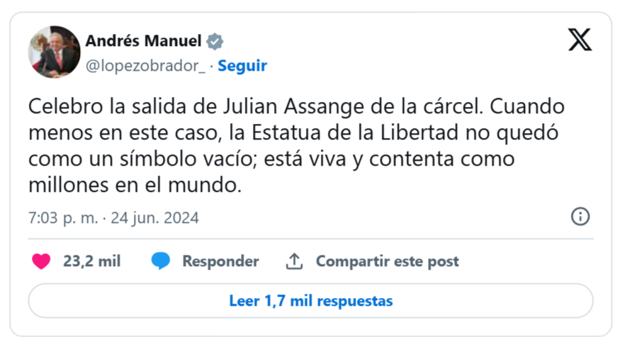 En conferencia de prensa matutina dijo que al salir de prisión Assange, el lunes 24 de junio, la Estatua de la Libertad en Estados Unidos, recobra sentido.