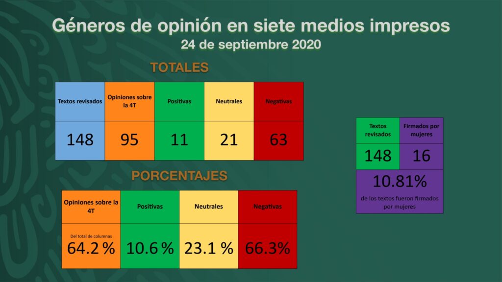 CIUDAD DE MEXICO.- El presidente Andrés Manuel López Obrador reafirmó su compromiso de respetar la libertad de expresión. En conferencia de prensa, presentó un análisis de 148 artículos de opinión en siete medios impresos del 24 de septiembre.