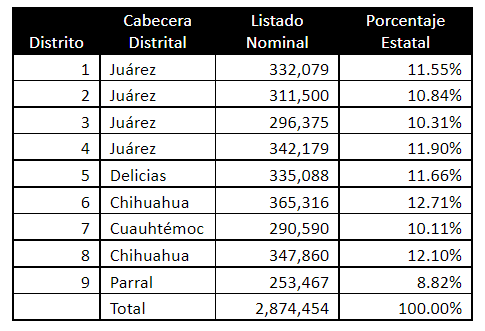 El estado de Chihuahua contempla nueve distritos electorales divididos en todo su territorio. En ellos las tasas de participación y la intención del voto se ha marcado diferenciadamente, al menos en los últimos cinco procesos electorales. Podemos concluir que hay un pluralismo político en el estado de acuerdo con las regiones norte, sur y centro.