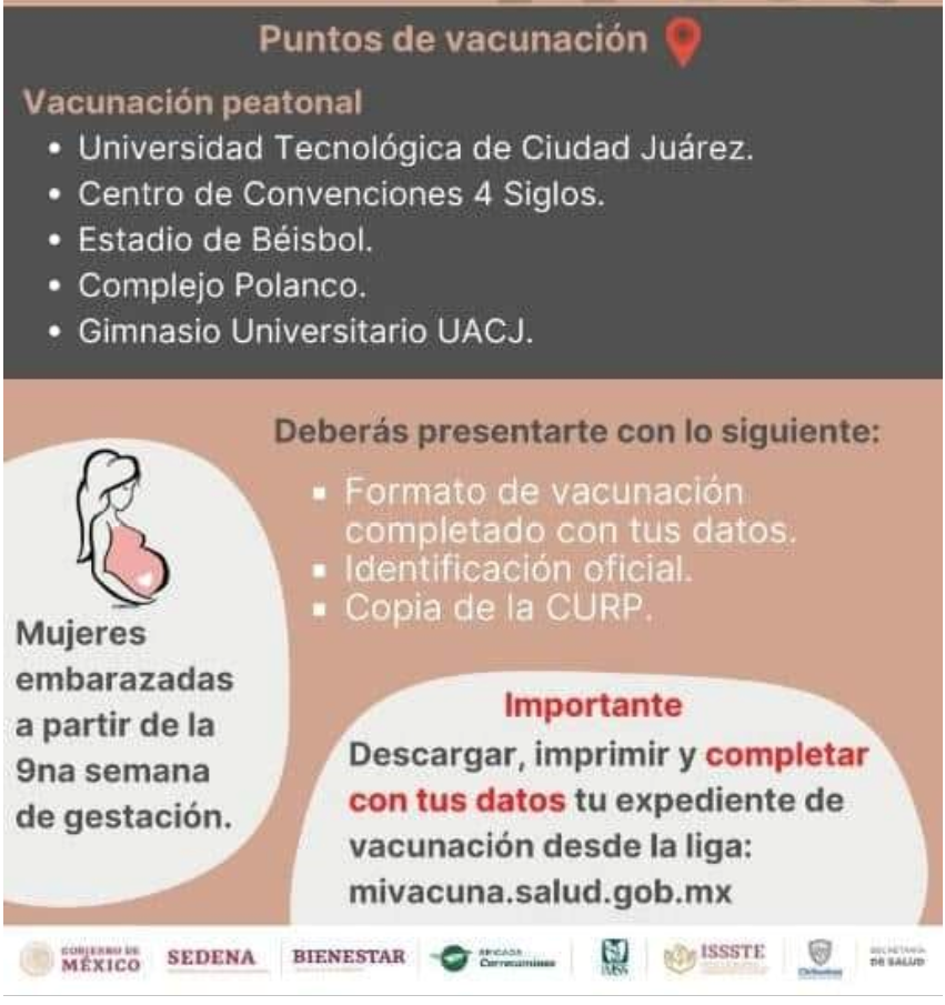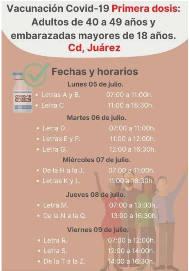 CD. JUAREZ, CHIH.- La Secretaría de Salud del Estado en conjunto con Secretaría de Bienestar informan a la comunidad del municipio de Juárez, que del día 5 al 9 de julio próximo se llevará a cabo la jornada de aplicación en primera dosis de vacuna contra Covid19, para el grupo poblacional de 40 a 49 años, así como a embarazadas mayores de 18 años de edad y con más de 9 semanas de gestación.