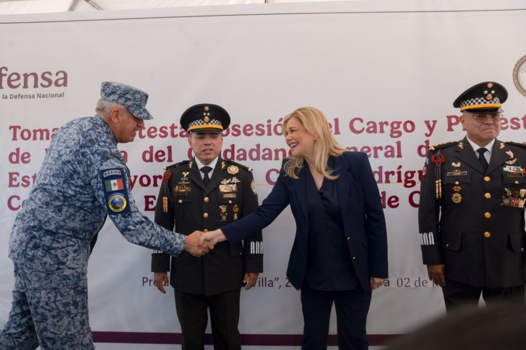 CHIHUAHUA, CHIH.- La gobernadora Maru Campos asistió como invitada especial a la toma de protesta del general de brigada, Diplomado de Estado Mayor, Israel Caro Rodríguez, como nuevo coordinador estatal de la Guardia Nacional en Chihuahua.