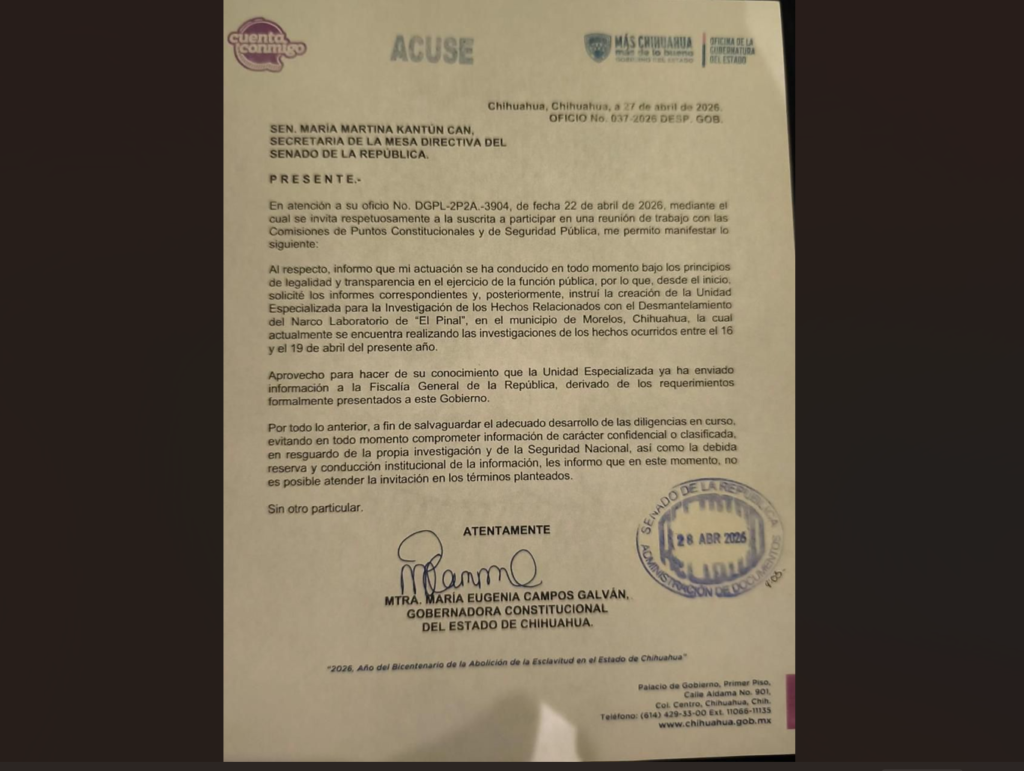 CHIHUAHUA, CHIH.- La gobernadora Maru Campos declinó participar en reunión de trabajo en el Senado de la República para no comprometer las investigaciones en curso. La decisión fue notificada mediante oficio dirigido a la senadora María Martina Kantún Can, secretaria de la Mesa Directiva del Senado.