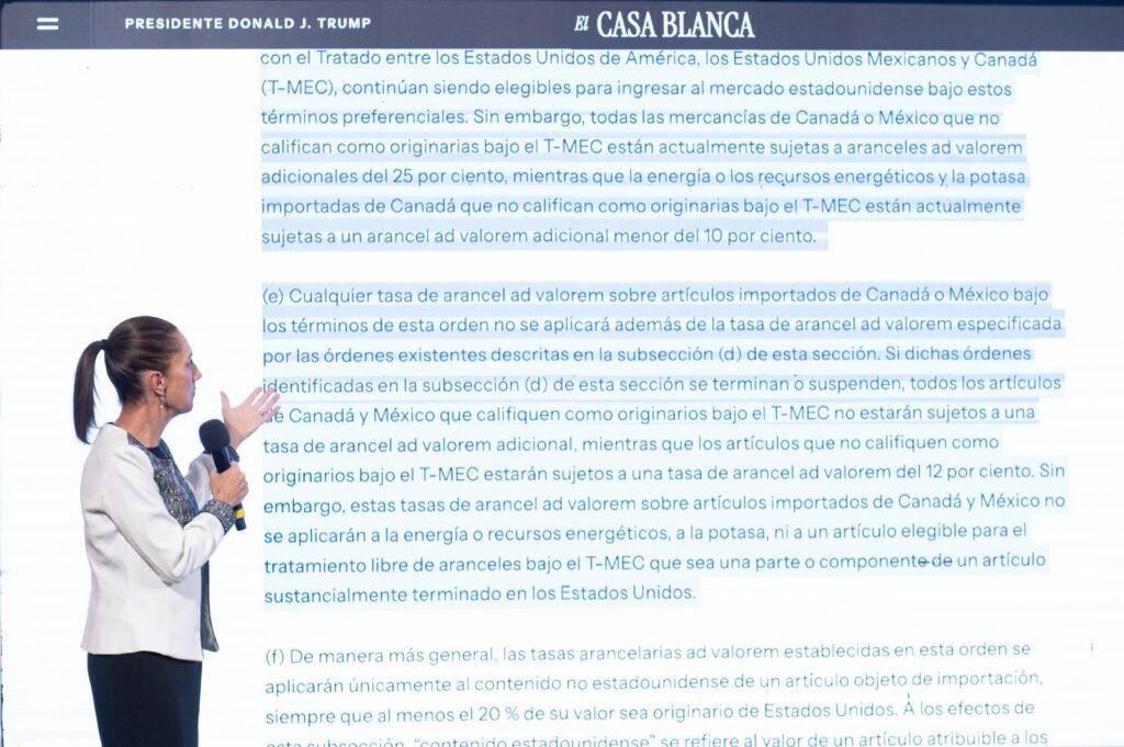 Anunció que continuarán las conversaciones respecto a los aranceles impuestos a todo el mundo a la industria automotriz, al acero y al aluminio. Mientras que en México se acelerará el Plan México para fortalecer la economía nacional.