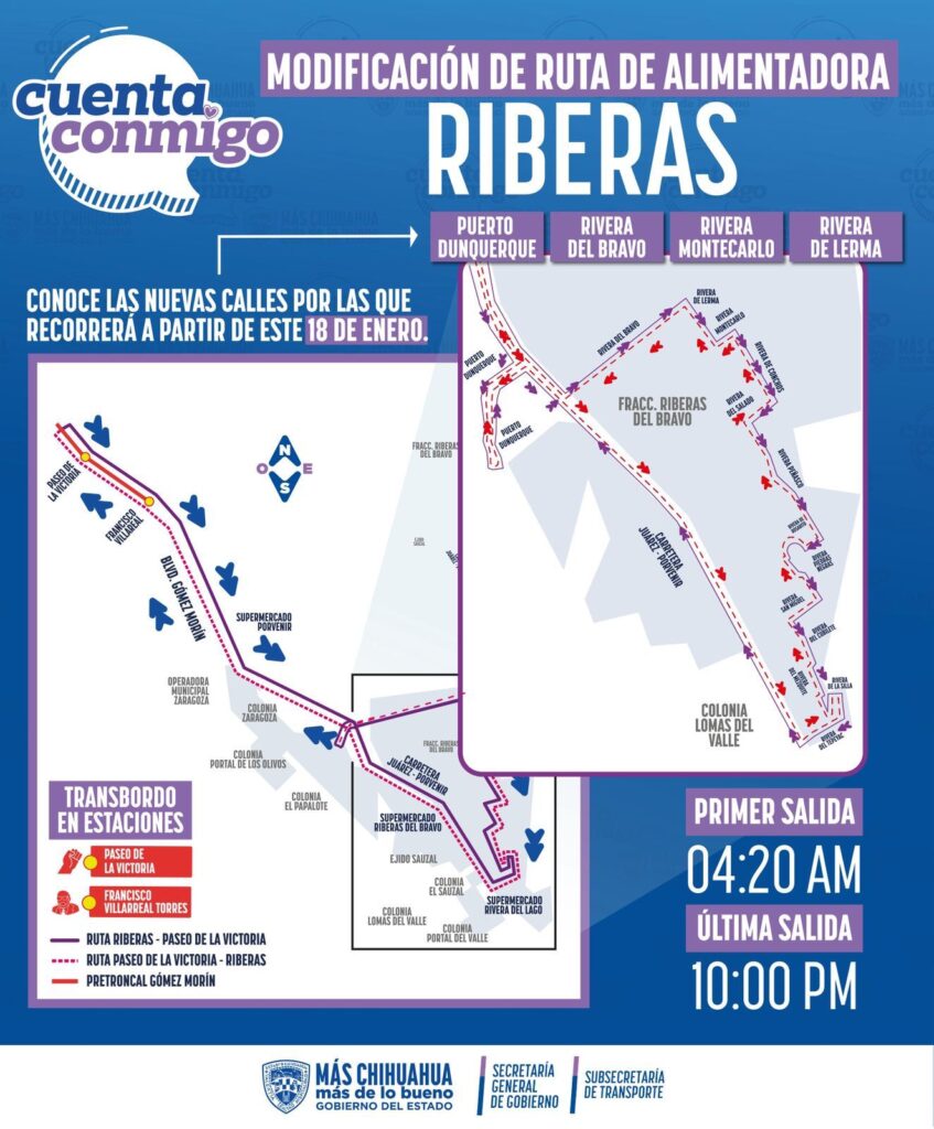 CD. JUAREZ, CHIH.- La Secretaría General de Gobierno, a través de la Subsecretaría de Transporte, informó que a partir de este domingo 18 de enero se modificará el recorrido de la ruta Riberas del Bravo del sistema de transporte JuárezBus, con el fin de beneficiar a un mayor número de habitantes.