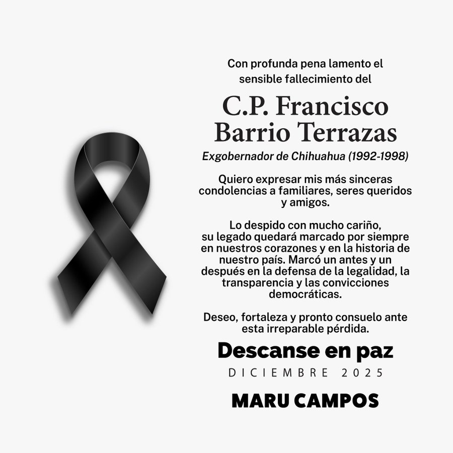Con profunda pena lamento el sensible fallecimiento del C. P. Francisco Barrio Terrazas, exgobernador de Chihuahua 1992-1998. Quiero expresar mis más sinceras condolencias a familiares, seres queridos y amigos.