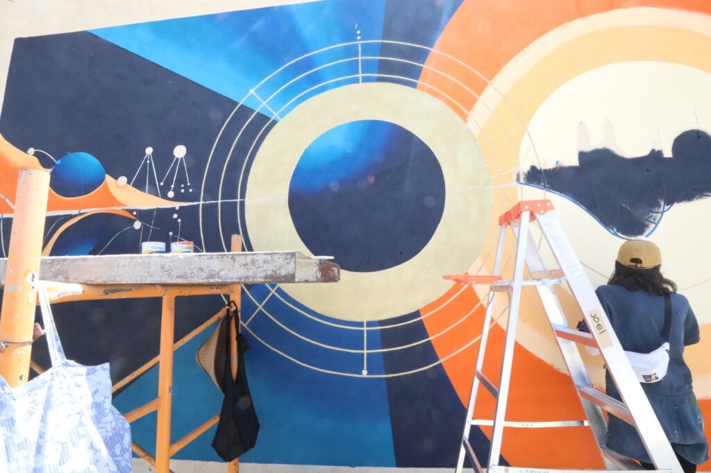 “Me pareció impresionando imaginarme a los fundadores de Juárez viendo el eclipse. Me imaginé que lo tomaron como una señal de que estaban en el lugar correcto y de eso habla la línea de tiempo, las estrellas que seguramente se veían impresionantes y en el centro del mural el eclipse que marca el punto inicial, mientras que en la derecha va evolucionando hasta llegar a lo que ahora es Ciudad Juárez”, comentó.