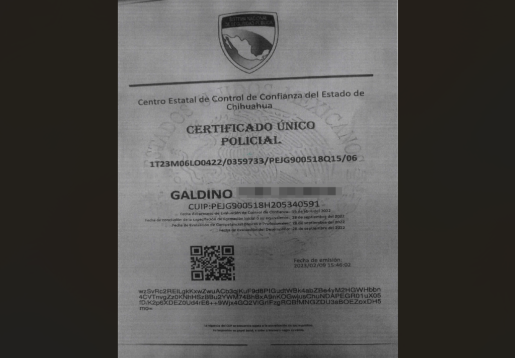 Además, informaron que Galdino P. J. cuenta con una constancia de no antecedentes penales y con el Certificado Único Policial (CUP), expedido por el Sistema Nacional de Seguridad Pública, documentos que, subraya la SSPM, no podrían haberse emitido si el elemento hubiera reprobado las evaluaciones correspondientes.