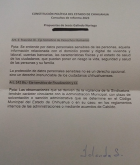 Con esa convocatoria abierta, acudí al foro programado en ciudad Juárez y dejé dos propuestas que considero inevitables en la oportunidad de la llamada reforma integral de la CPECH. Sin poder quedarme en el evento aquella mañana del 7 de enero, solamente dejé en mano de una de las asistentes organizadoras las propuestas ejecutivamente impresas en una hoja (sin explicar motivaciones ni razones), pero con un textgo entendible que pueda ser reforzado y corregido por los especialistas de preparar el proyecto de la reforma, obteniendo a cambio una tímida firma en calidad de acuse de recibo, sin fecha y sin marca del Congreso o de la comisión organizadora.