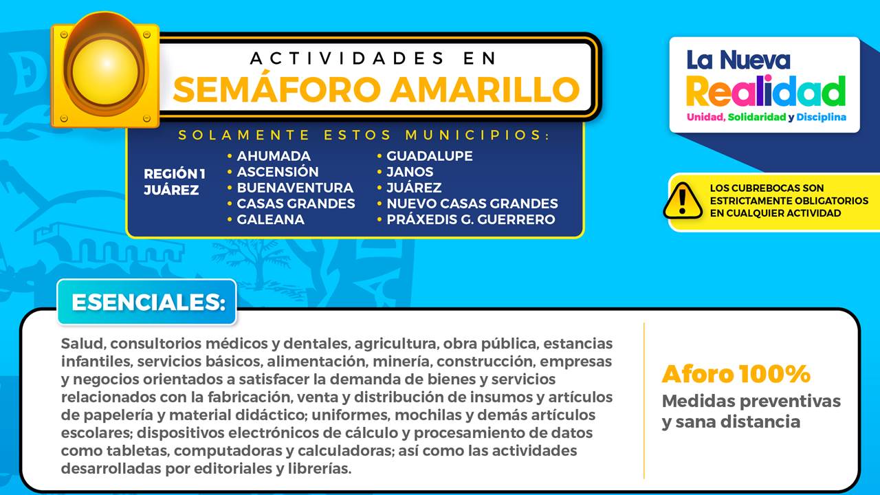 La Región Norte comprende los municipios de Juárez, Ahumada, Ascensión, Buenaventura, Casas Grandes, Nuevo Casas Grandes, Galeana, Guadalupe, Janos y Práxedis G. Guerrero, que son los únicos que avanzan en el semáforo; el resto se mantiene en naranja por presentar riesgo epidemiológico alto.