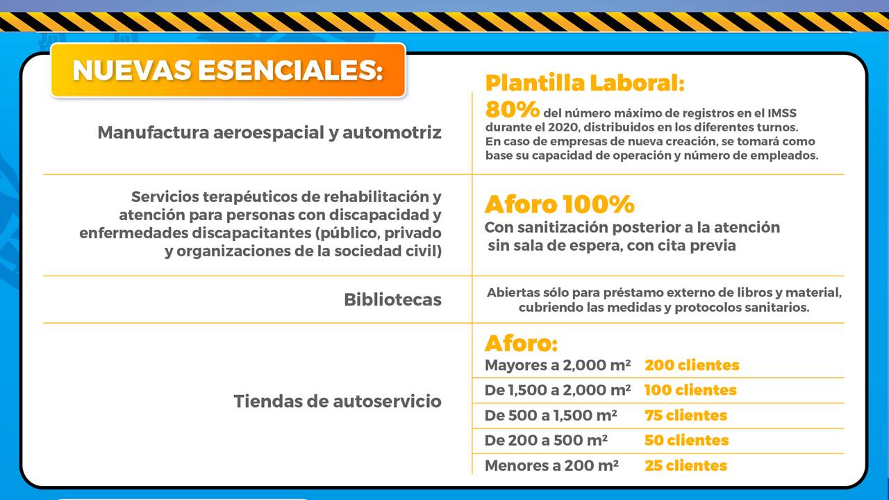Las consideradas actividades esenciales continúan con el 100% de aforo en el semáforo amarillo, que según los lineamientos establecidos en los acuerdos 83/2020 y 102/2020 de la Secretaría de Salud del Gobierno de México son los siguientes: