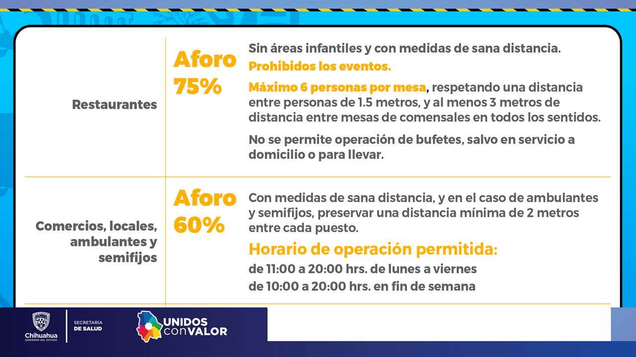CHIHUAHUA, CHIH.- Con la publicación del nuevo Acuerdo 109/2020 en el Periódico Oficial del Estado, a partir de este día en los 10 municipios de la Región Juárez que pasó al amarillo en la semaforización, se permite la reapertura con un aforo del 30 por ciento en teatros, cines, bares, centros culturales, gimnasios y balnearios, además de templos o centros de culto religioso.