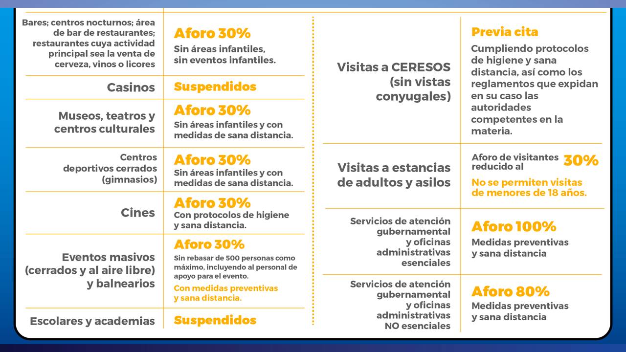 Se reactivan salones de eventos con un aforo de 30% que deberán operar sin áreas infantiles. En este rubro, la Secretaría de Salud autorizará la apertura y definirá el aforo permitido para cada establecimiento, mediante una certificación emitida de forma previa a la apertura. La certificación deberá colocarse en un lugar visible del establecimiento.