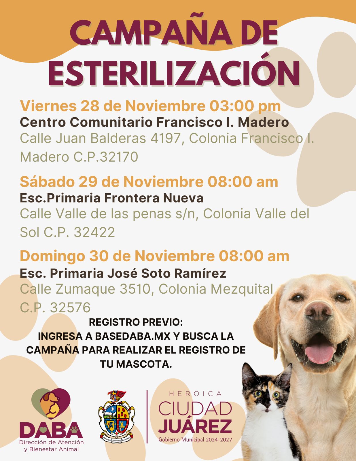 CD. JUAREZ, CHIH.- La Dirección de Atención y Bienestar Animal (DABA), llevará a cabo durante este fin de semana la campaña de Esterilización gratuita en distintos puntos de la ciudad.