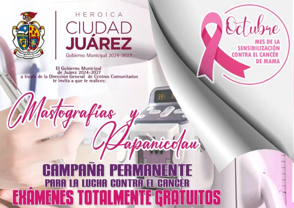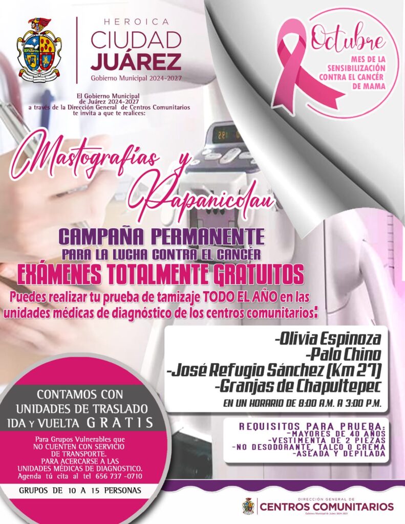 CD. JUAREZ, CHIH.- El Gobierno Municipal, a través de la Dirección de Centros Comunitarios, ofrece mastografías y papanicolaou gratis.
