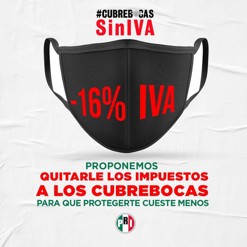 Con ese motivo, la dirigencia nacional del PRI, encabezada por Alejandro Moreno y Carolina Viggiano, lanzó este día una campaña en redes sociales, con la etiqueta #CubrebocasSinIVA, con objeto de promover que en el paquete económico del 2022, que se discute en el Congreso de la Unión, se establezca la exención de las mascarillas. “En el PRI sabemos que la salud y el bolsillo de los mexicanos es prioridad”, dijo.