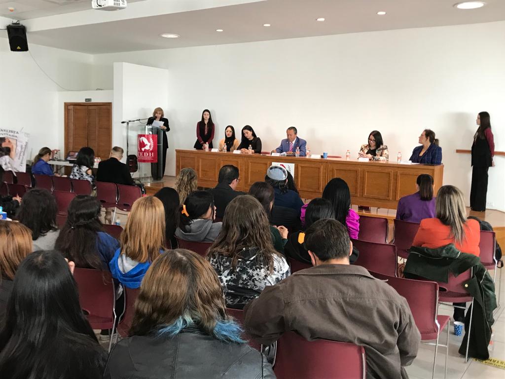 El evento se llevó a cabo esta mañana en el auditorio de la Comisión Estatal de los Derechos Humanos (CEDH), dirigido a estudiantes y maestros del Centro de Bachillerato Tecnológico, industrial y de servicios (CBTis) #128, en donde participó la Coordinadora Regional de la FEM, Yubia Yumiko Ayala Narváez.