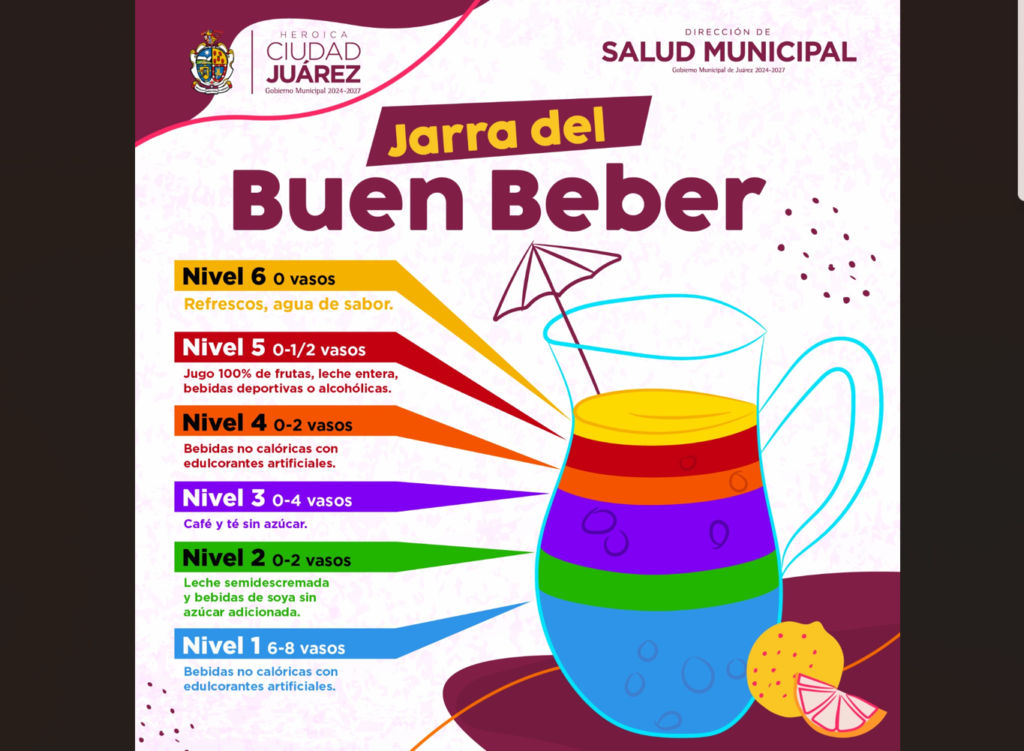 Para orientar a la población, la Secretaría de Salud elaboró el material informativo denominado “La Jarra del Buen Beber”, similar al “Plato del Bien Comer”, el cual clasifica las bebidas en seis niveles de acuerdo con la cantidad recomendada para su consumo diario.